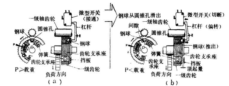 圖b為超負(fù)荷狀態(tài),符合扭矩超過(guò)彈簧力時(shí),二級(jí)軸齒輪和一級(jí)軸齒軸分離,鋼球從圓錐孔推出,擋板被頂出。擋板推動(dòng)杠桿偏轉(zhuǎn)時(shí),操作回路的微型開(kāi)關(guān)切斷,停止運(yùn)轉(zhuǎn)。