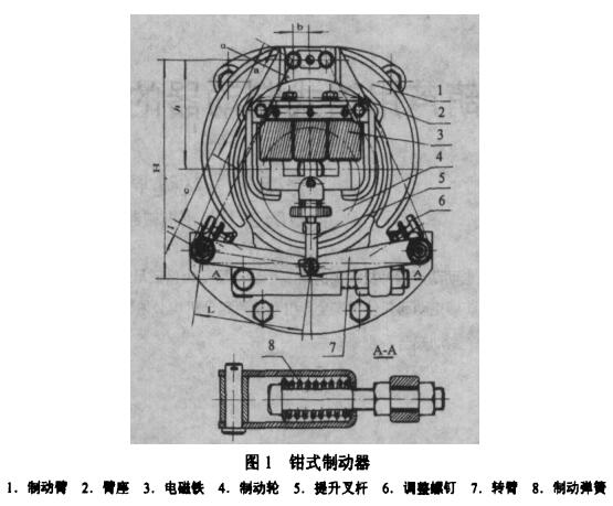 鉗式制動(dòng)器結(jié)構(gòu)如圖1.它的主要制動(dòng)臂1、臂座2、電磁鐵3、制動(dòng)輪4、轉(zhuǎn)臂7和制動(dòng)彈簧8組成。它是常閉式制動(dòng)器,通電時(shí)起升電動(dòng)機(jī)旋轉(zhuǎn),輸力矩起吊載荷,同時(shí)制動(dòng)器電動(dòng)器電磁鐵吸合,打開制動(dòng)器;切斷電源時(shí),起升電機(jī)制動(dòng),鉗式制動(dòng)器電磁鐵打開,制動(dòng)臂在彈簧力的作用下抱緊制動(dòng)輪制動(dòng)載荷,電磁鐵是長行程電磁鐵。
