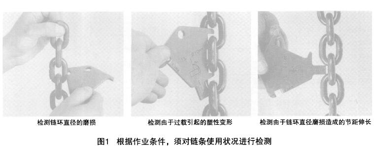 (3)檢查鏈環(huán)磨損及伸長:用生產(chǎn)廠商提供的標牌進行簡單檢測 (見圖1 ) 。