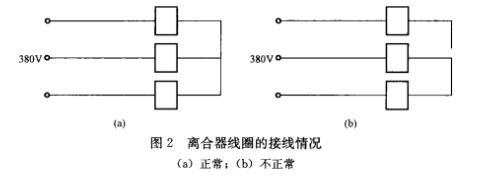 從圖2(a)可以看出,正常的情況下,3個線圈的電壓都是220V,3個線圈都能正常地吸合,離合器也能正常的離合,上升和下降時電動機(jī)能正常地工作,但在有一個線圈的一端脫離中點后,中點就不存在了,見圖2(b)。3個線圈中,一個線圈沒有電壓,另兩個線圈的電壓為380/2V=190V,每個線圈雖說有190V,但這兩個線圈是串聯(lián)的,不能保證兩個線圈的阻抗是相等的,這時3個線圈都不可能正常地工作,造成了離合器不能正常地勤離合。離合器的工作不正常,就造成了電動葫蘆上升和下降時的阻力增大,電動機(jī)就不能正常的工作工作,電動葫蘆就不可能正常的上升和下降了。