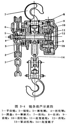 圖3-4為齒輪式手拉鏈條葫蘆。當提升重物時,手拉鏈1使鏈輪2按順時針方向轉動。鏈輪2沿著圓盤5套筒上的螺紋向里一動,而將棘輪圈3和摩擦片6都壓緊在鏈輪軸4上(鏈輪軸4與圓盤5牢固形成一體),棘輪圈3只能順時針方向轉動,棘爪在棘輪圈3上跳動發(fā)出嗒嗒之聲。鏈輪軸4右端的齒輪12帶動齒輪9(或稱行星齒輪)與固定齒圈8相嚙合,使齒輪9沿鏈輪軸4為中心順時針方向移動。同時帶動驅動機構13和起重鏈輪11轉動,使起重鏈子14上升。當不拉手拉鏈之后,重物是靠自重產生的自鎖現象和棘爪組織棘輪圈3逆時針方向轉動而停止在空中。反之,當松下重物時,手拉鏈1使鏈輪2和圓盤5分離。則鏈輪軸4右端的齒輪12帶動齒輪9與固定齒圈8相嚙合,使齒輪9沿鏈輪軸4為中心逆時針方向轉動,同時帶動驅動機構13和起重鏈輪11轉動,使起重鏈子14下降。當不拉手拉鏈之后,因鏈輪2停止轉動時,起重鏈輪11受重物自重還要繼續(xù)沿逆時針方向轉動,行星齒輪傳動機構同樣沿逆時針方向繼續(xù)轉動,使圓盤5、摩擦片6及棘輪圈3相互之間相互壓緊而產生摩擦力,棘輪圈3受棘爪阻止不能向逆時針方向轉動,于是摩擦力作用在螺紋上產生自鎖,使重物停止在空中。