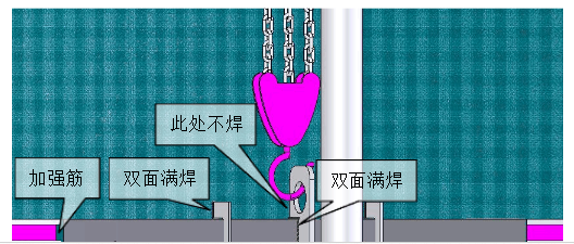 脹圈用槽鋼滾弧制成,曲率半徑與儲(chǔ)罐內(nèi)徑相同。在電動(dòng)葫蘆正下方的脹圈上焊接吊耳。此處需特別注意,脹圈吊耳兩側(cè)各一米左右需采用加強(qiáng)筋與加強(qiáng)版加固,吊耳只與脹圈焊接,不得將吊耳與罐壁相焊,以免提升時(shí)電動(dòng)葫蘆的傾角拉力造成罐壁下側(cè)向內(nèi)受拉變形。脹圈與罐壁使用龍門卡具相連,龍門卡具的位置不得靠吊耳過近,太近容易造成罐壁受拉變形,也不得離吊耳過遠(yuǎn),過遠(yuǎn)會(huì)造成脹圈受扭轉(zhuǎn)力過大而變形。