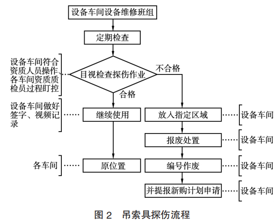 由設(shè)備車間定期進(jìn)行檢查檢測(cè),經(jīng)過探傷后合格的吊索具交由原車間繼續(xù)使用,并做好相關(guān)視頻和紙質(zhì)記錄;對(duì)檢測(cè)不合格的,要放入指定區(qū)域,集中報(bào)廢處置并做好記錄,同時(shí)啟動(dòng)新購流程。