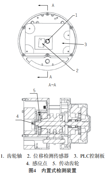內(nèi)置式高度檢測(cè)裝置如圖4所示,它主要由齒輪軸、位移檢測(cè)傳感器和PLC控制板組成。齒輪軸位于電動(dòng)葫蘆內(nèi),齒輪軸貫穿PLC控制板,PLC控制板上設(shè)有位移檢測(cè)傳感器,位移檢測(cè)傳感器位于齒輪軸旁,PLC控制板與位移檢測(cè)傳感器電連接,齒輪軸上設(shè)有感應(yīng)點(diǎn),感應(yīng)點(diǎn)與位移檢測(cè)傳感器配合。根據(jù)不同葫蘆的結(jié)構(gòu),在葫蘆電機(jī)的齒輪軸上,布置一個(gè)凸起或凹陷的感應(yīng)開(kāi)關(guān)感應(yīng)點(diǎn)用于檢測(cè)該軸的轉(zhuǎn)動(dòng)圈數(shù)。電動(dòng)葫蘆必須配置控制的PLC或單片機(jī),用于處理感應(yīng)開(kāi)關(guān)檢測(cè)到軸的轉(zhuǎn)動(dòng)圈數(shù)。每臺(tái)環(huán)鏈電動(dòng)葫蘆會(huì)根據(jù)實(shí)際鏈條長(zhǎng)度,預(yù)先在程序中設(shè)定好鏈條的首位限位點(diǎn)。PLC或單片機(jī)程序設(shè)定好檢測(cè)的軸與起重鏈條運(yùn)行距離的比例,再根據(jù)檢測(cè)軸轉(zhuǎn)動(dòng)的圈數(shù)計(jì)算出鏈條運(yùn)行的距離,實(shí)時(shí)計(jì)算出吊鉤的高度,當(dāng)鏈條運(yùn)行到限位點(diǎn)時(shí)會(huì)自動(dòng)停機(jī),起到限位的作用。