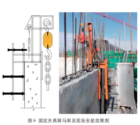 (1)用塔吊將固定夾具騎馬架、電動葫蘆吊裝到檐溝操作平臺作業(yè)面處。固定夾具騎馬架騎扣在倉壁鋼牛腿預(yù)埋件的正上方。在每個固定夾具騎馬架馬頭上掛鉤孔掛 1 個 6.8T 電動葫蘆,本項目共設(shè)計26個,其數(shù)量依據(jù)為荷載:桁架23.58T+模板、鋼管、扣件、施工荷載 15.78T=39.36T ;電動葫蘆起重荷載6.8T,葫蘆荷載減半計算為3.4T,39.36/26=1.52T,所以選擇 26 個 6.8T 的電動葫蘆足以滿足施工要求(見圖6)。