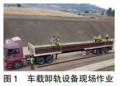 從設(shè)備的耐用性出發(fā),設(shè)備需要結(jié)構(gòu)簡單,操作簡單,維修方便,制作維護(hù)成本低,從設(shè)備的安全性出發(fā),設(shè)備需要滿足長途運(yùn)輸過程中自身不脫落車體,并且滿足在裝卸鋼軌過程中的承重能力達(dá)到要求,從設(shè)備的快速機(jī)動(dòng)性出發(fā),起重裝置需采用電力驅(qū)動(dòng),以提升起重升降的效率。另外設(shè)備的運(yùn)行狀態(tài)需 要針對鋼軌運(yùn)輸過程中的各種狀態(tài)快速切換,如在基 地裝車鋼軌時(shí)不能影響大型龍門吊作業(yè),運(yùn)至現(xiàn)場后 快速切換至卸軌作業(yè)狀態(tài),作業(yè)狀態(tài)中卸軌后行進(jìn)至下一卸軌里程點(diǎn)的短程行進(jìn)狀態(tài)與裝卸狀態(tài)能夠快速切換,根據(jù)上述需求,從實(shí)際情況出發(fā),項(xiàng)目所使用的運(yùn)軌設(shè)備是兩臺國內(nèi)采購的可伸縮平板車,縮合狀態(tài)時(shí)長度為12m可用于運(yùn)送軌枕,最大伸長狀態(tài)時(shí)長度為18m 用于運(yùn)送鋼軌,則需要將卸軌設(shè)備與平板車結(jié)合起來。參照已有的大型龍門架,可以在平板車上設(shè)計(jì)一 個(gè)縮小版的門架式體系,平板車頂面兩側(cè)設(shè)有數(shù)個(gè)插槽,原本是為防止運(yùn)輸中鋼軌脫落放置立柱使用,現(xiàn)可借助該立柱,輔以一根橫梁以及一根立于地面的支柱,形成一個(gè)門架式體系,門架式體系形成后,模仿基地裝卸鋼軌的大型龍門吊,在橫梁上安裝一個(gè)可以滑動(dòng)的電動(dòng)葫蘆,在車尾處安裝一臺發(fā)電機(jī)以提供動(dòng)力。在鋼軌上選取兩個(gè)吊點(diǎn)設(shè)置兩組門架體系,使用裝在橫梁上電動(dòng)葫蘆的夾具,即可成功達(dá)到裝卸鋼軌的目的,如圖1所示。