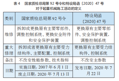 關(guān)于更換電動(dòng)葫蘆的施工定性,主要由《起重機(jī)械安全監(jiān)察規(guī)定》(國(guó)家質(zhì)檢總局第 92 號(hào)令)和之后發(fā)布實(shí)施的《市場(chǎng)監(jiān)管總局特設(shè)局關(guān)于明確起重機(jī)械有關(guān)名詞術(shù)語(yǔ)含義的通知》(特設(shè)局函〔2020〕47 號(hào))這兩個(gè)文件予以規(guī)定,具體定義詳見(jiàn)表 4,其中國(guó)家質(zhì)檢總局第 92 號(hào)令已廢止。