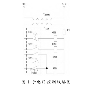 手電門控制電動葫蘆的控制器線路圖如圖1所示,急停開關 SB1 拔起后接觸器 KM1 得電,電動葫蘆動力電上電,SB2 和 SB3 為雙擋按鈕,通過操作按鈕控制電動葫蘆以低速或高速進行上升或者下降運行,手電門通過移動電纜和牽引繩懸掛在葫蘆下方隨葫蘆水平方向一起運行。