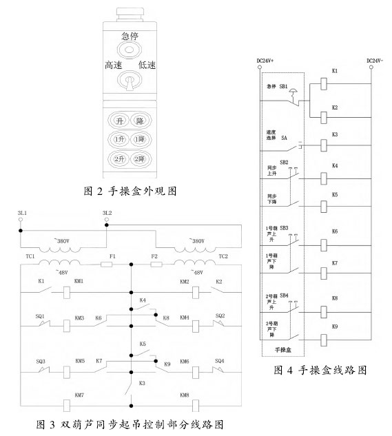 針對環(huán)鏈電動葫蘆的手電門控制和變頻器控制的缺點,在不改變兩臺獨立電動葫蘆機械結構的情況下可利用改造手電門電路的方式控制兩臺環(huán)鏈電動葫蘆,用以實現(xiàn)雙吊點同步起吊工作,即用一個手操盒控制兩臺葫蘆同步完成上升或下降動作。 對兩臺電動葫蘆的控制進行改造,手操盒以及部分電路圖見圖 2—圖 4。