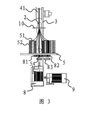 一種環(huán)形穿絲吊裝帶的生產(chǎn)裝置,它包括一塊固定板(3),在固定板(3)上設(shè)有用于撐開環(huán)形穿絲吊裝帶(11)的滾輪組(4),滾輪(41)驅(qū)動(dòng)裝置與其中至少一個(gè)滾輪(41)相聯(lián)并可通過該滾輪(41)帶動(dòng)環(huán)形絲吊裝帶(11)轉(zhuǎn)動(dòng),其特征在于,所述的固定板(3)的側(cè)部設(shè)有一個(gè)轉(zhuǎn)盤(5),在轉(zhuǎn)盤(5)上設(shè)有若干個(gè)用于放置線團(tuán)(52)的線架(51),轉(zhuǎn)盤(5)具有一個(gè)供撐開在滾輪組(4)上的環(huán)形穿絲吊裝帶(11)進(jìn)入并垂直穿過轉(zhuǎn)盤(5)中心的缺口(53),上述轉(zhuǎn)盤(5)與一個(gè)當(dāng)撐開在滾輪(41)組(4)上的環(huán)形穿絲吊裝帶(11)轉(zhuǎn)動(dòng)時(shí)可帶動(dòng)轉(zhuǎn)盤(5)上的各個(gè)線架(51)繞環(huán)形穿絲吊裝帶(11)轉(zhuǎn)動(dòng)的轉(zhuǎn)盤(5)驅(qū)動(dòng)裝置相聯(lián)接,所述的轉(zhuǎn)盤(5)驅(qū)動(dòng)裝置包括一個(gè)與電機(jī)一(8)相聯(lián)的主驅(qū)動(dòng)齒輪(81),在轉(zhuǎn)盤(5)的底部中心設(shè)有一個(gè)與主驅(qū)動(dòng)齒輪(81)相嚙合的轉(zhuǎn)動(dòng)齒輪(54),轉(zhuǎn)動(dòng)齒輪(54)具有與轉(zhuǎn)盤(5)上的缺口(53)上下對(duì)應(yīng)的開(54a),在轉(zhuǎn)動(dòng)齒輪(54)旁還設(shè)有一個(gè)副驅(qū)動(dòng)齒輪(82),所述的副驅(qū)動(dòng)齒輪(82)通過同步傳動(dòng)帶(83)與主驅(qū)動(dòng)齒輪(81)相連。