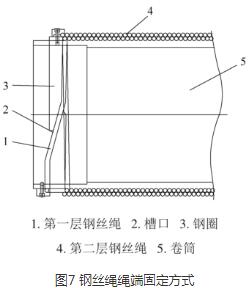 由于第一層鋼絲繩和第二層鋼絲繩在卷筒上有高度差(即鋼絲繩直徑差),使得在卷筒上固定時不能很好的固定,故需在卷筒上鋼絲繩固定端焊接一鋼圈,鋼圈上開一槽口,將第一層鋼絲繩穿過槽口用壓繩器固定在卷筒上,第二層鋼絲繩用壓繩器固定在鋼圈外表面上完成整個電動葫蘆的繞繩。如圖7所示。