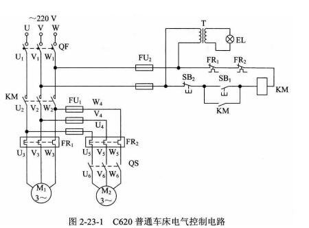 C620普通車床電氣控制電爐如圖2-23-1所示,M1,M2為容量小于10kw的電動機,采用全壓直接起動,均為單方向旋轉(zhuǎn)。M1由接觸器KM實現(xiàn)起動、停止控制,M2由轉(zhuǎn)換開關(guān)QS控制。M1、M2分別由熱繼電器FR1、FR2實現(xiàn)電動機長期過載保護,由熔斷器FU1、FU2實現(xiàn)M2電動及、控制電爐及照明電爐的短路保護。照明電爐由變壓器T供給電壓,控制照明燈