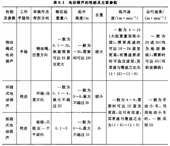 電動(dòng)葫蘆有鋼絲繩式、環(huán)鏈?zhǔn)胶桶彐準(zhǔn)饺N形式。電動(dòng)葫蘆的性能及主要參數(shù)表如表8.2所示。