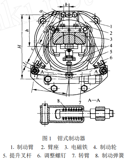 它主要由制動臂1、臂座2、電磁鐵3、制動輪4、轉(zhuǎn)臂7和制動彈簧8組成。為常閉式制動器,通電時起升電動機(jī)旋轉(zhuǎn),輸出力矩起吊載荷,同時,制動器電磁鐵吸合,打開制動器;切斷電源時,起升電機(jī)制動,鉗式制動器電磁鐵打開,制動臂在彈簧力作用下抱緊制動輪制動載荷。電磁鐵是長行程電磁鐵。