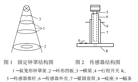 傳感器外殼固定在套筒上,底座則與套筒固定在一起、三者連為一體。設(shè)置環(huán)形擋板和輻條是因為在電動葫蘆制動后,底座和重物砣由于受到自身重力的作用,必然要下滑一段距離,當?shù)鬃禄絺鞲衅魍茥U端部時,輻條碰住環(huán)形擋板上表面,底座停止下滑,這樣可避免將推桿從傳感器外殼中拉出。同時,環(huán)形擋板還起著在底座上升時閉合行程開關(guān)的作用。因此,環(huán)形擋板和輻條的安放位置十分關(guān)鍵。環(huán)形擋板的位置應保證在測試過程中重物饦推動底座上升到行程開關(guān)碰住環(huán)形擋板底部時,傳感器端部與底座之間仍有一微小距離,這樣就防止了底座撞擊傳感器端部而損壞傳感器。輻條的位置應保證底座下滑到碰到環(huán)形擋板時,推桿剛好到達傳感器大位置且未從外殼中拉出。